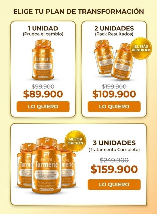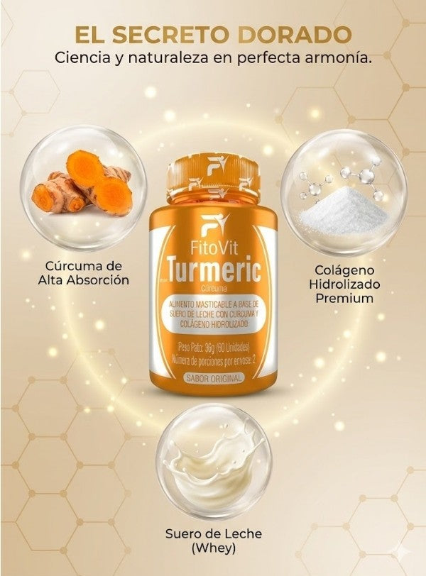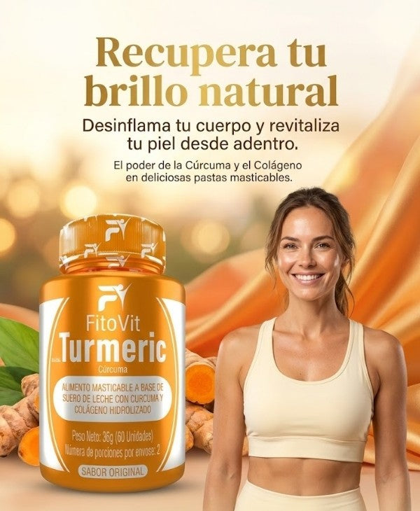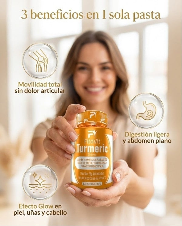FitoVit Turmeric es un alimento en pastas masticables, elaborado con cúrcuma y colágeno hidrolizado, y cuenta con registro INVIMA, lo que garantiza su calidad y seguridad.