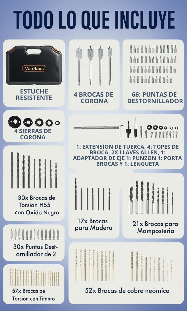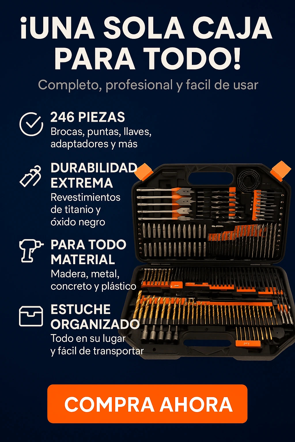 - 🔧 246 piezas totales: Incluye brocas para concreto, madera, metal, puntas de destornillador, sierras, adaptadores, y más.