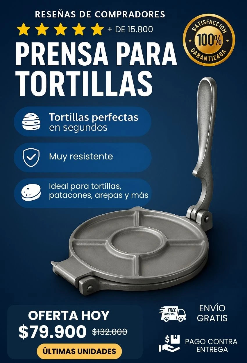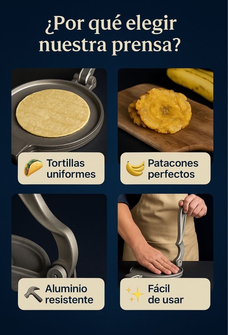 Resistente, fácil de usar y con diseño ideal para preparar tortillas, patacones, arepas y más.